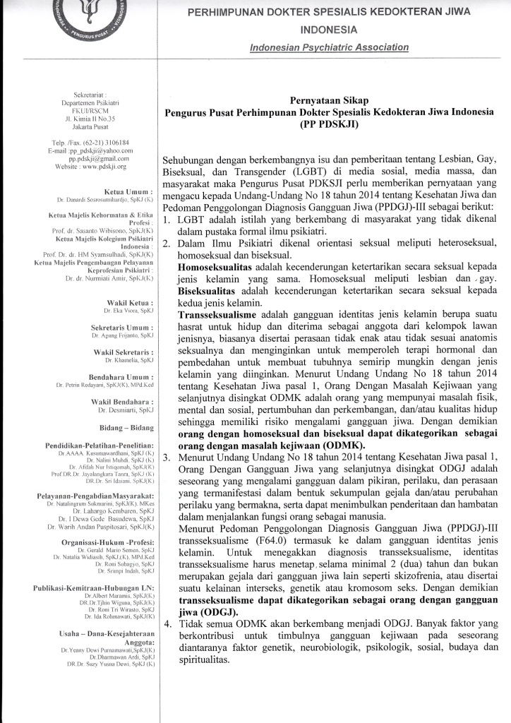 Surat Pernyataan PDSKJI Tentang LGBT (Hal 1)